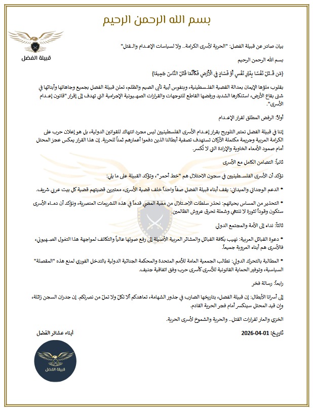 بقلوب ملؤها الإيمان بعدالة القضية الفلـ.ـسطينية، وبنفوس أبية تأبى الضيم والظلم، تعلن قبيلة الفضل بجميع وجاهاتها وأبنائها في شتى بقاع الأرض، استنكارها الشديد ورفضها القاطع للتوجهات والقرارات الصهـ.ـيونية الإجرامية التي تهدف إلى إقرار "قانون إعـ.ـدام الأسرى".
